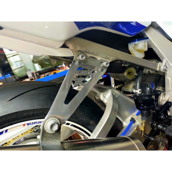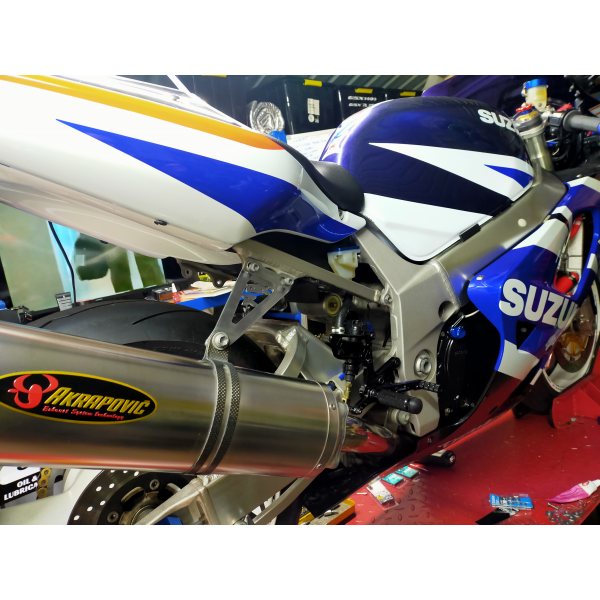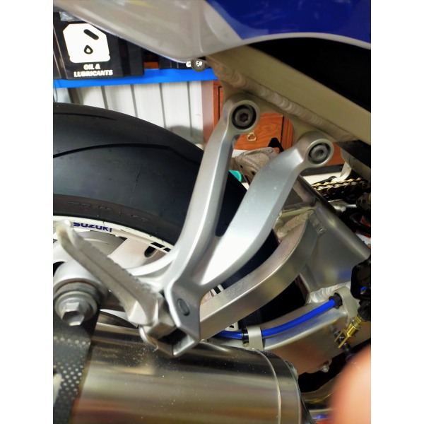 As with most bling jobs the pillion passenger footpeg that the exhaust hangs off eventually gets replaced with an aftermarket. Especially when the other side gets removed.