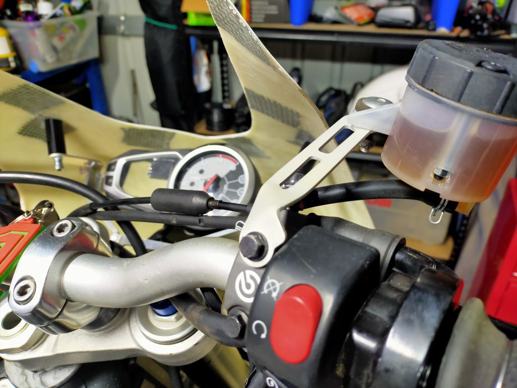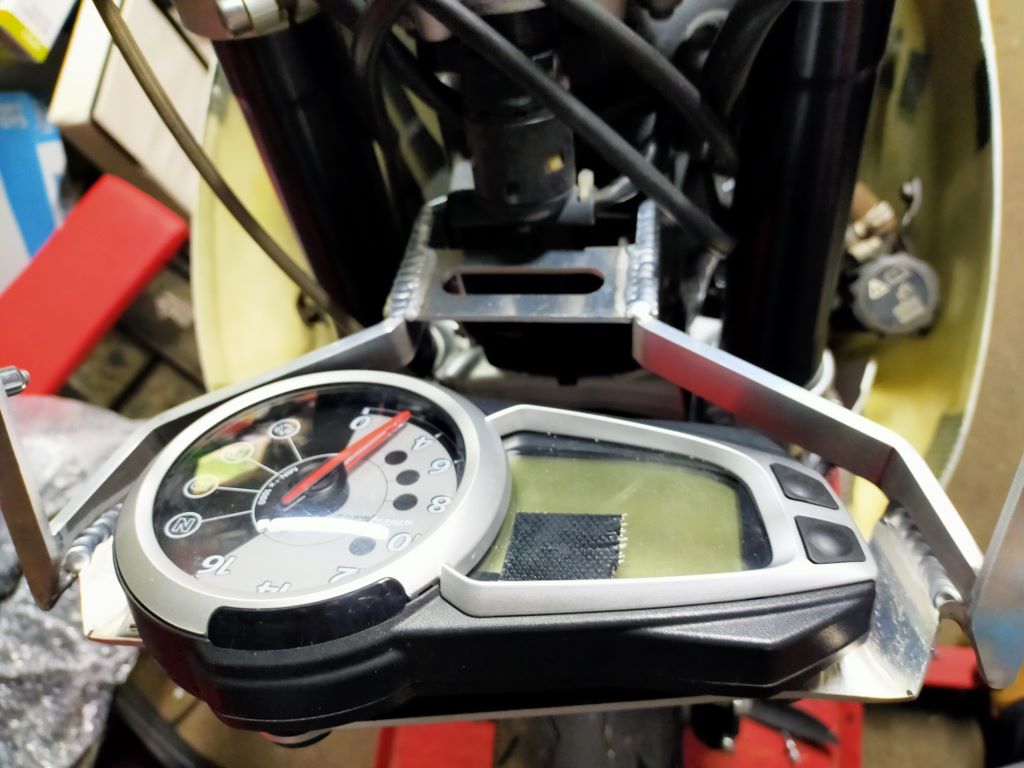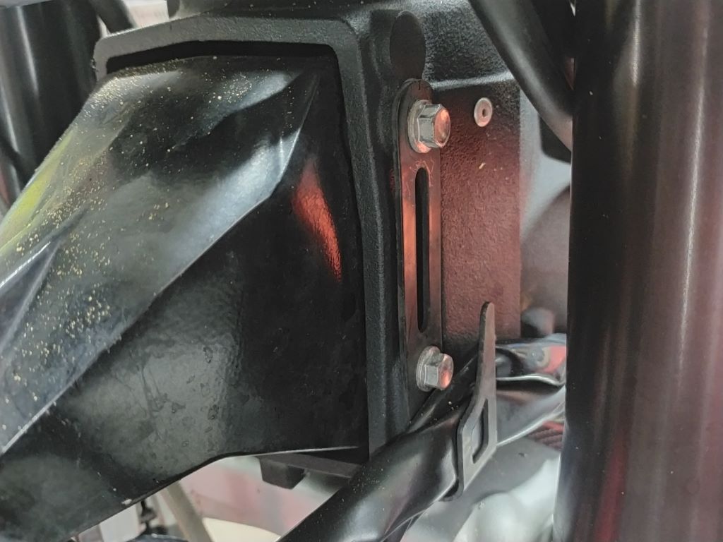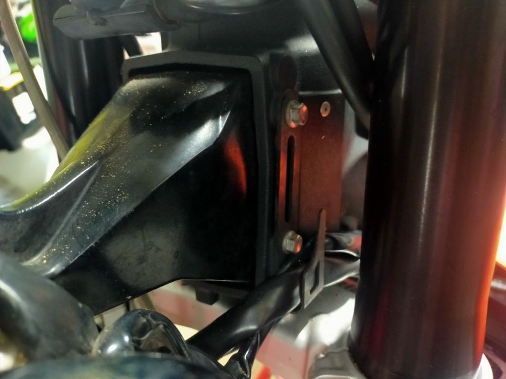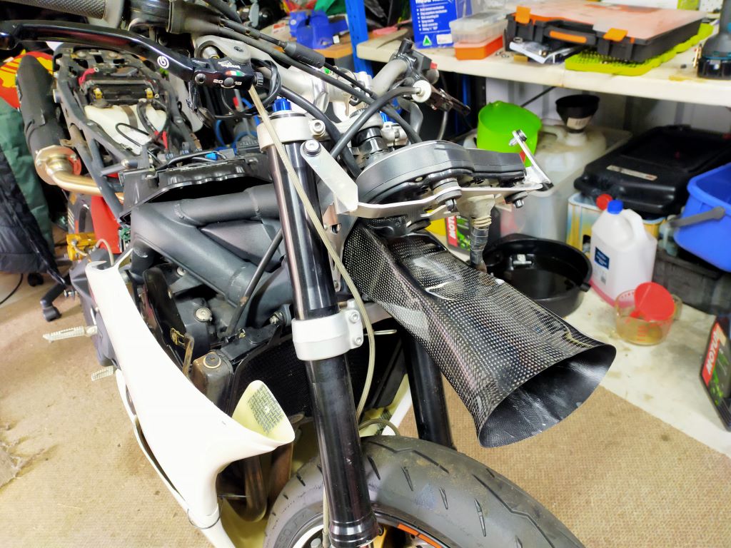 The aftermarket stay can now be fixed, this is required so the front mask or fairing can be secured fully. You have to remove the three (3) rubber grommets from the oem plastic backing plate and fix them in the after market mount. The dash will now fit and be fixed in the plate. the dash cable simple fits in underneath. Before all of that you have to drill and fit the carbon fibre air scoop/ tunnel, fairly fiddly. I put it in the housing and the drilled through the bolt holes on the mounting and through the carbon. Then fitted the top nut and bolt, then drilled out the botton of the scoop whilst fitted and couldn’t move now because of the top bolt. Then fitted bottom bolt, remember to add the metal aftermarket dash mount too haha.